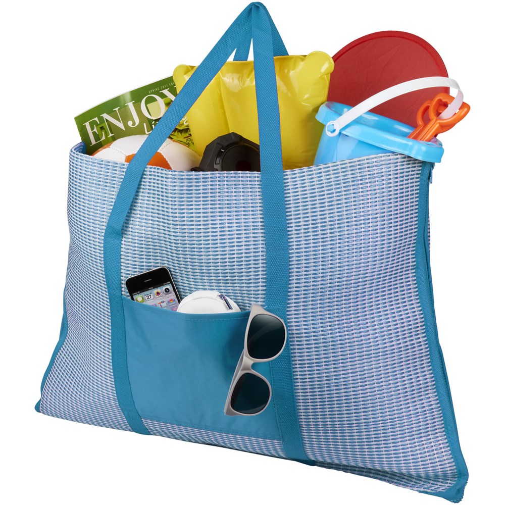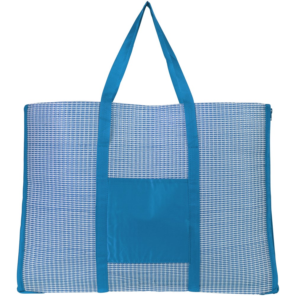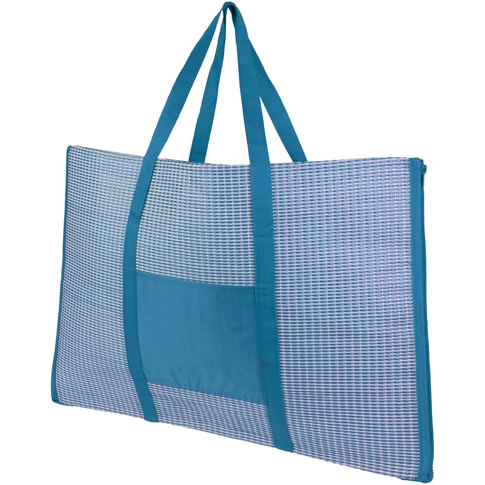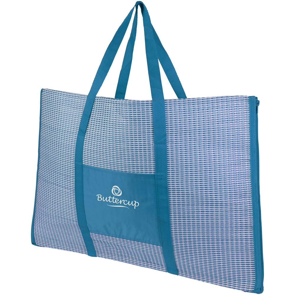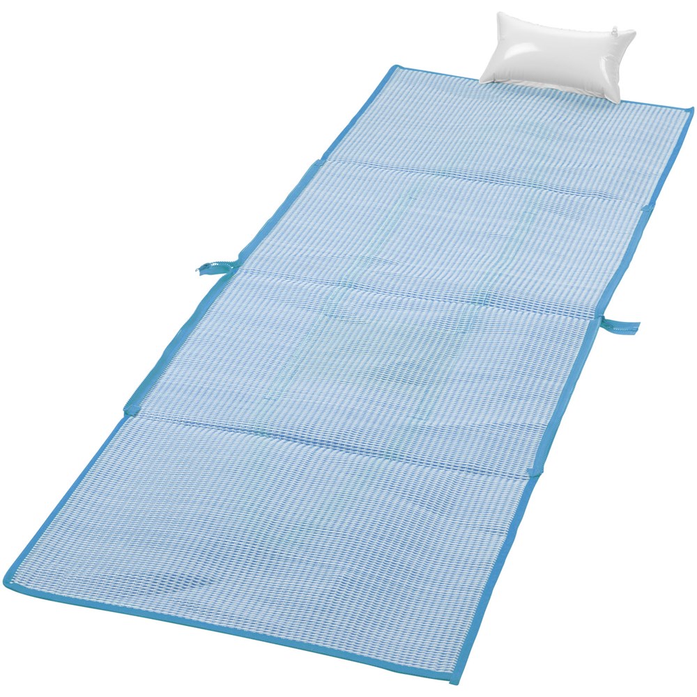 2-in-1 opvouwbare strandmat in een handige schoudertas van 60 x 44 cm. Inclusief zakje en opblaasbaar kussen. Lengte hengsel 28 cm.