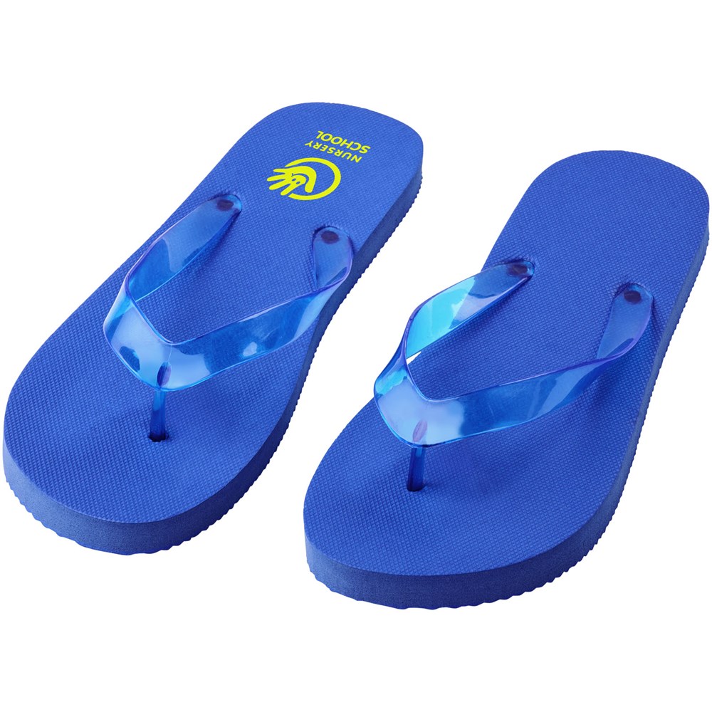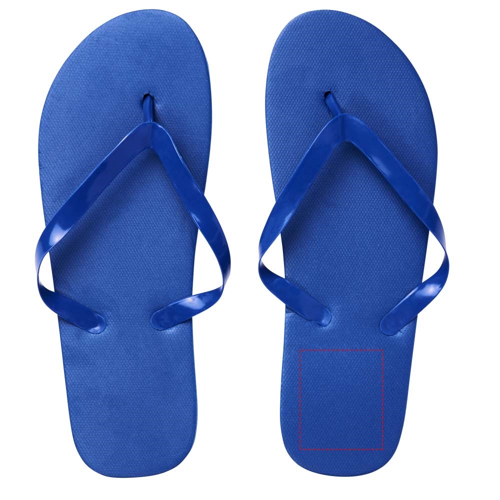 Set comfortabele strandslippers in een breed scala aan kleuren met polyethyleen zool en PVC band. Leverbaar in twee verschillende maten: M 36-38 en L: 42-44. Dit is een bewezen giveaway tijdens het zomerseizoen. Door de aard en het gebruik van dit product staan logo's bloot aan slijtage.