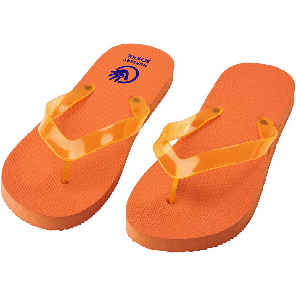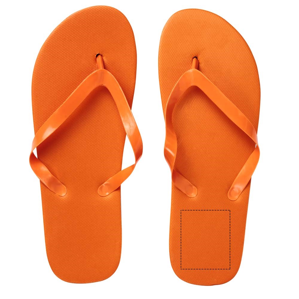 Set comfortabele strandslippers in een breed scala aan kleuren met polyethyleen zool en PVC band. Leverbaar in twee verschillende maten: M 36-38 en L: 42-44. Dit is een bewezen giveaway tijdens het zomerseizoen. Door de aard en het gebruik van dit product staan logo's bloot aan slijtage.