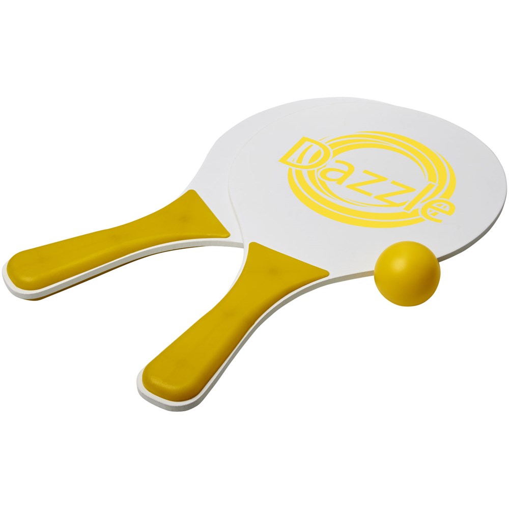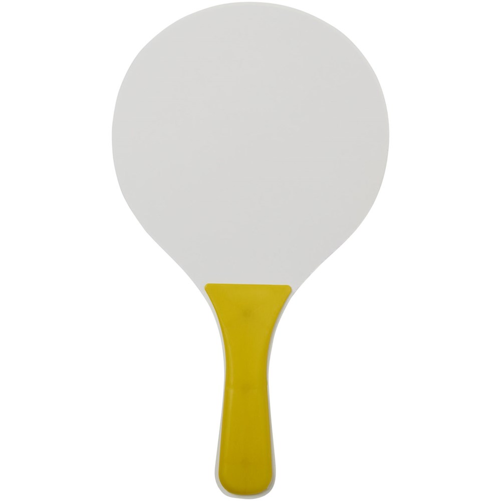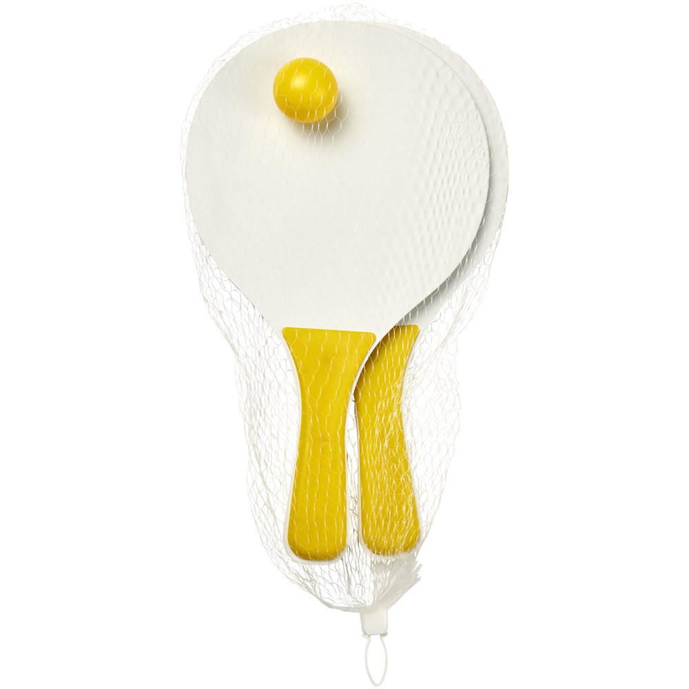 Altijd plezier met deze strandspelset die in de meest diverse kleuren wordt aangeboden. Deze duurzame strandspelset is gemaakt van MDF-hout met gekleurde PP handgreep. Verpakt samen met een zachte bal in een soortgelijke kleur in een netverpakking, waardoor het gemakkelijk is om mee te nemen op een leuke dag naar het strand.