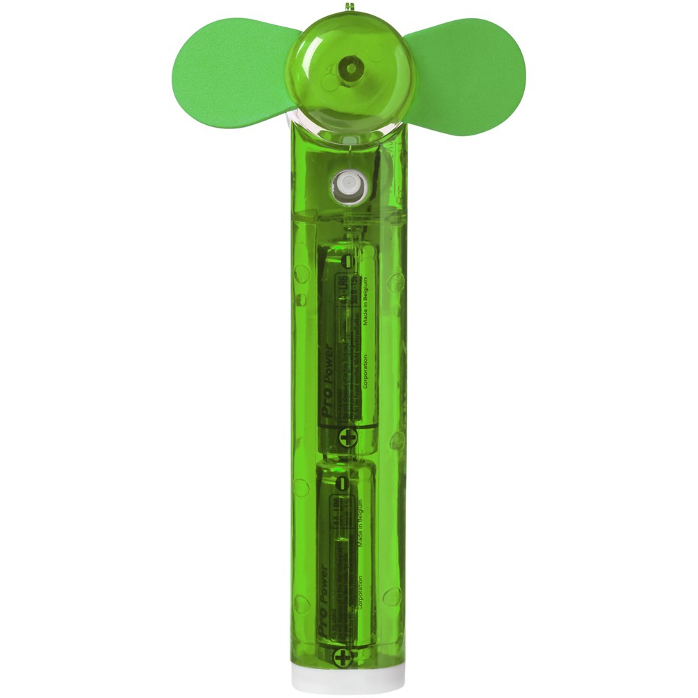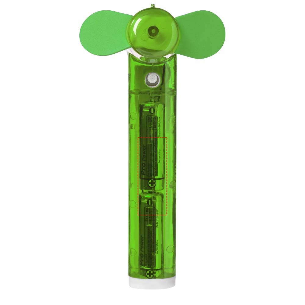 Zakventilator met kleine watercontainer en spray voor extra verkoeling. 2x AA batterijen inbegrepen.