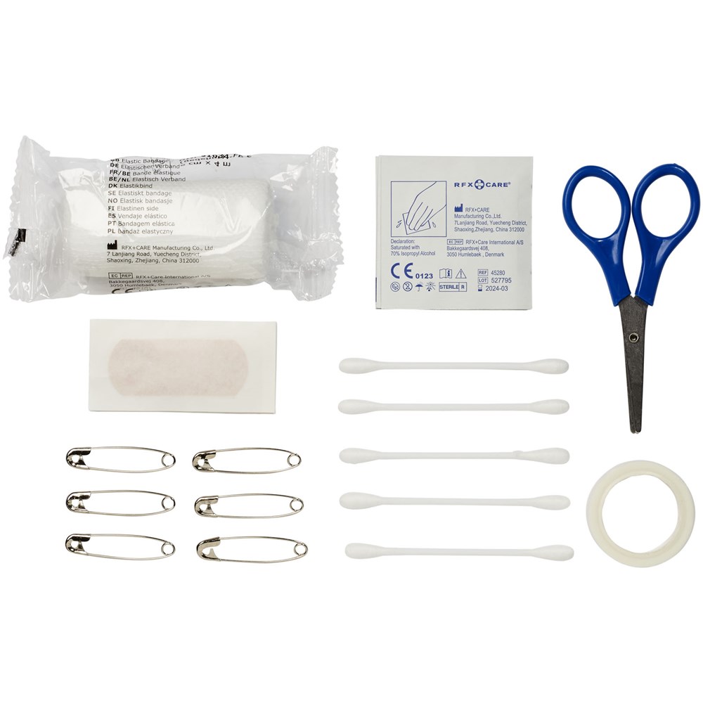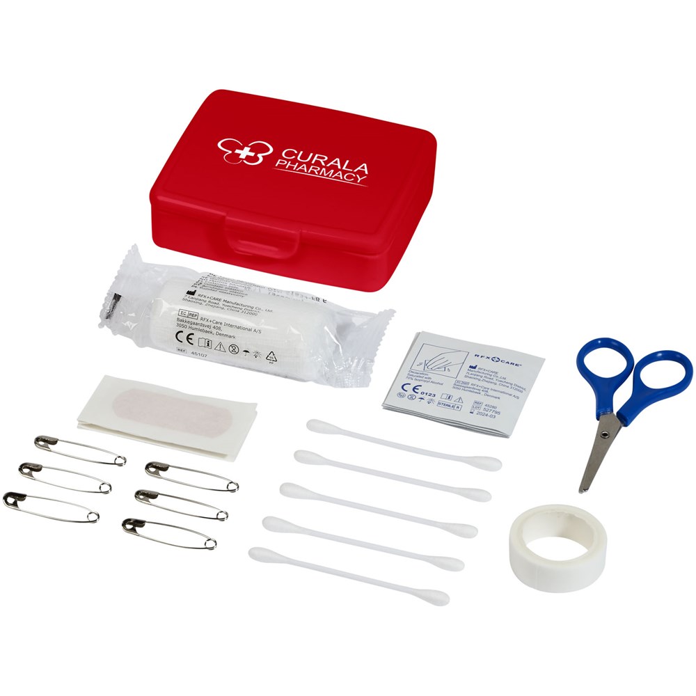 Handige kunststof doos met vouwdeksel met 24 EHBO-benodigdheden. Zeer geschikt voor thuis, in de auto of op het werk en heeft een groot decoratievlak op het deksel. EHBO-sets helpen je bij het uitvoeren van een eenvoudige wondbehandeling om de secundaire verwondingen te verminderen. Een EHBO-koffer wordt beschouwd als een medisch hulpmiddel en is onderworpen aan 93/42/EEG, op basis van het beoogde gebruik: "diagnose, preventie, controle, behandeling of verlichting van ziekte". Dit medisch hulpmiddel is van KLASSE I, Is.