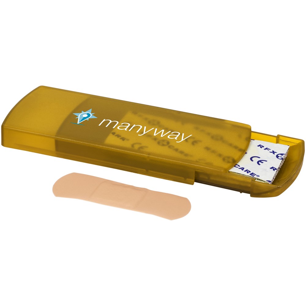 Draagbare minibox met 5 plakpleisters van 56x19 mm, bedoeld voor gebruik op kleine snij- en schaafwonden. De pleisterbox heeft een groot decoratievlak. De plakpleisters zijn gereguleerd, getest en gecertificeerd als Medische Hulpmiddelen van Klasse I in overeenstemming met de Richtlijn Medische Hulpmiddelen MDD 93/42/EEG van 14 juni 1993.