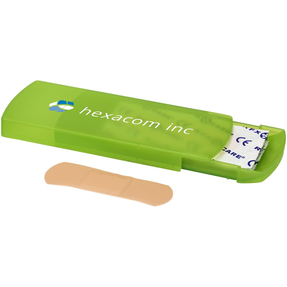 Draagbare minibox met 5 plakpleisters van 56x19 mm, bedoeld voor gebruik op kleine snij- en schaafwonden. De pleisterbox heeft een groot decoratievlak. De plakpleisters zijn gereguleerd, getest en gecertificeerd als Medische Hulpmiddelen van Klasse I in overeenstemming met de Richtlijn Medische Hulpmiddelen MDD 93/42/EEG van 14 juni 1993.