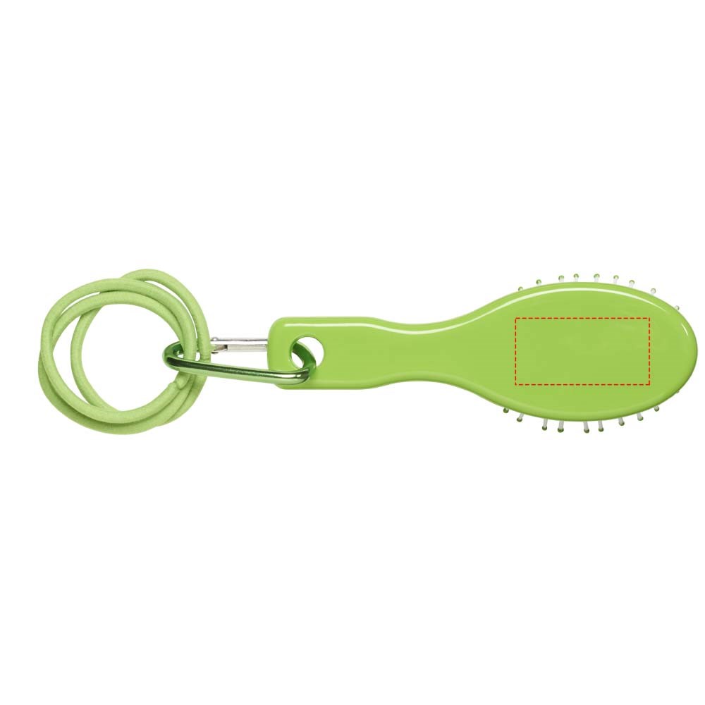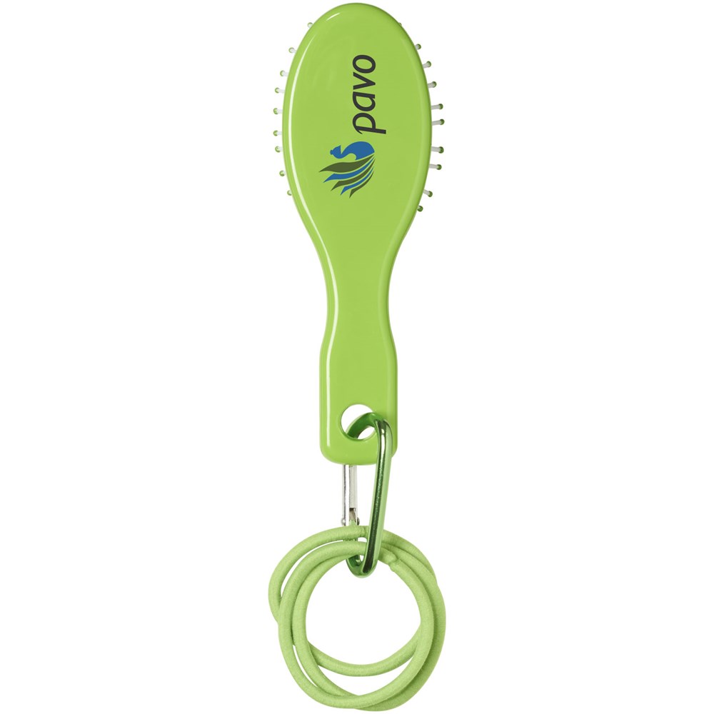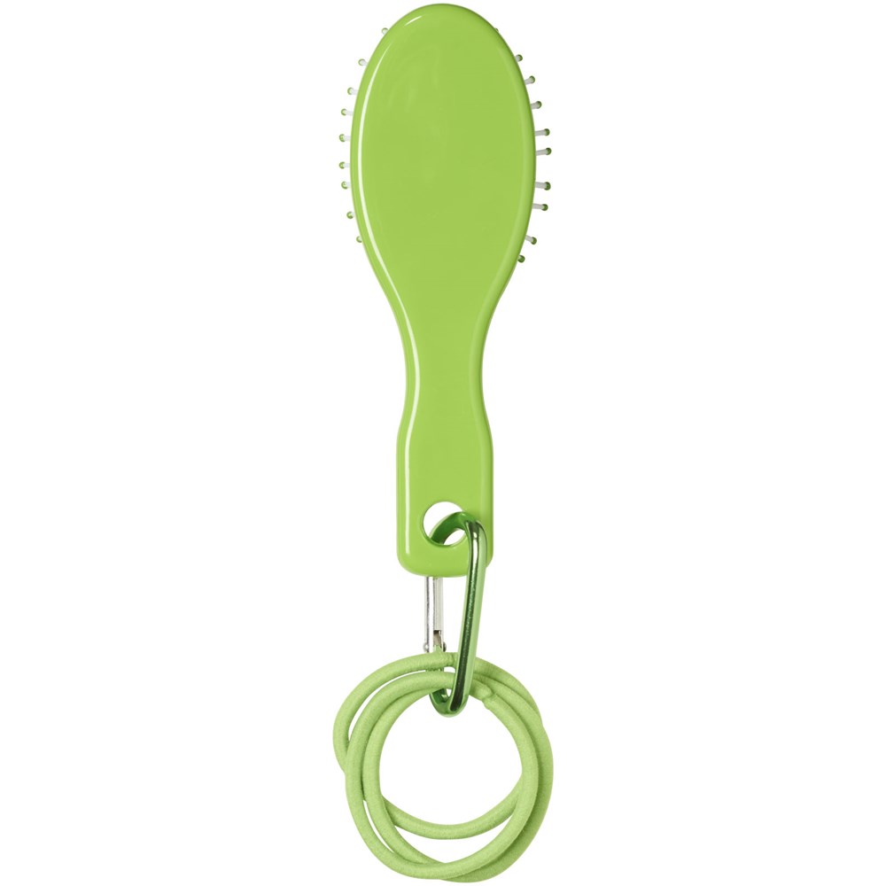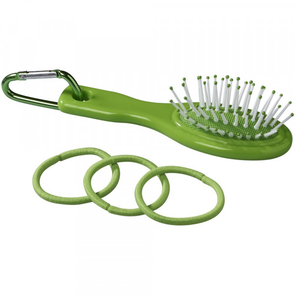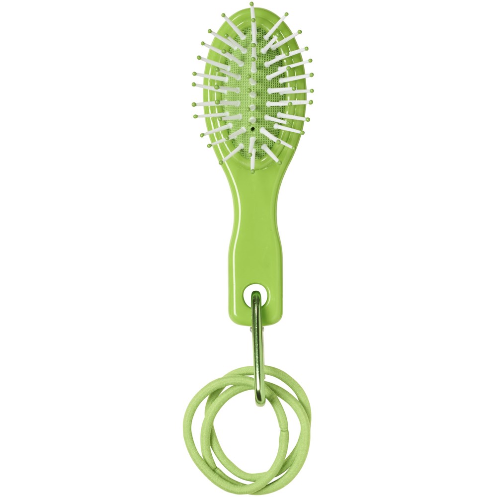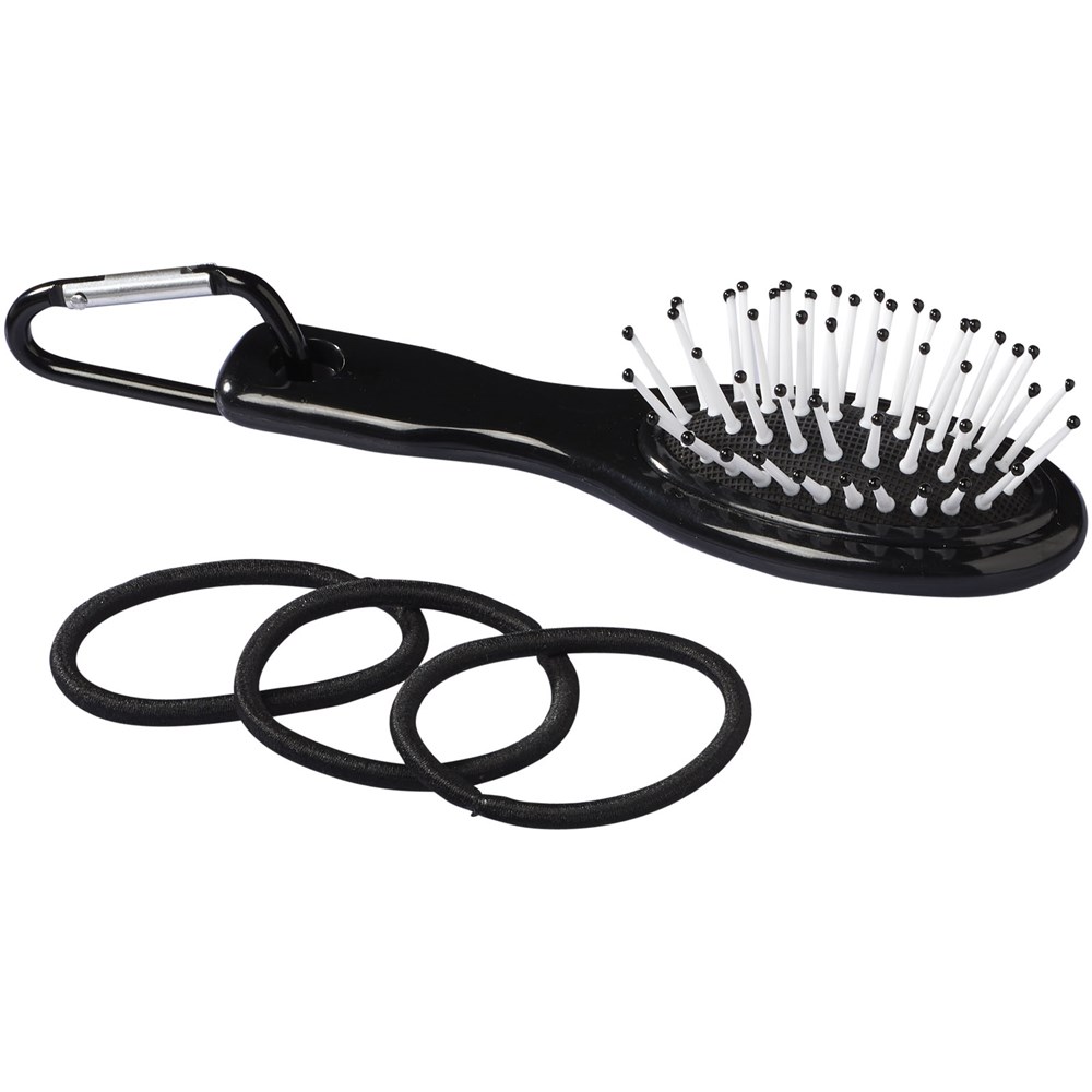 Een reismodel haarborstel, 3 haar elastiekjes en een mini aluminium karabijner.