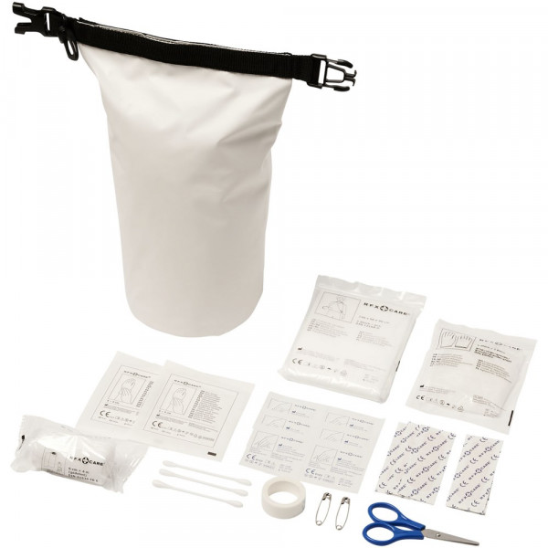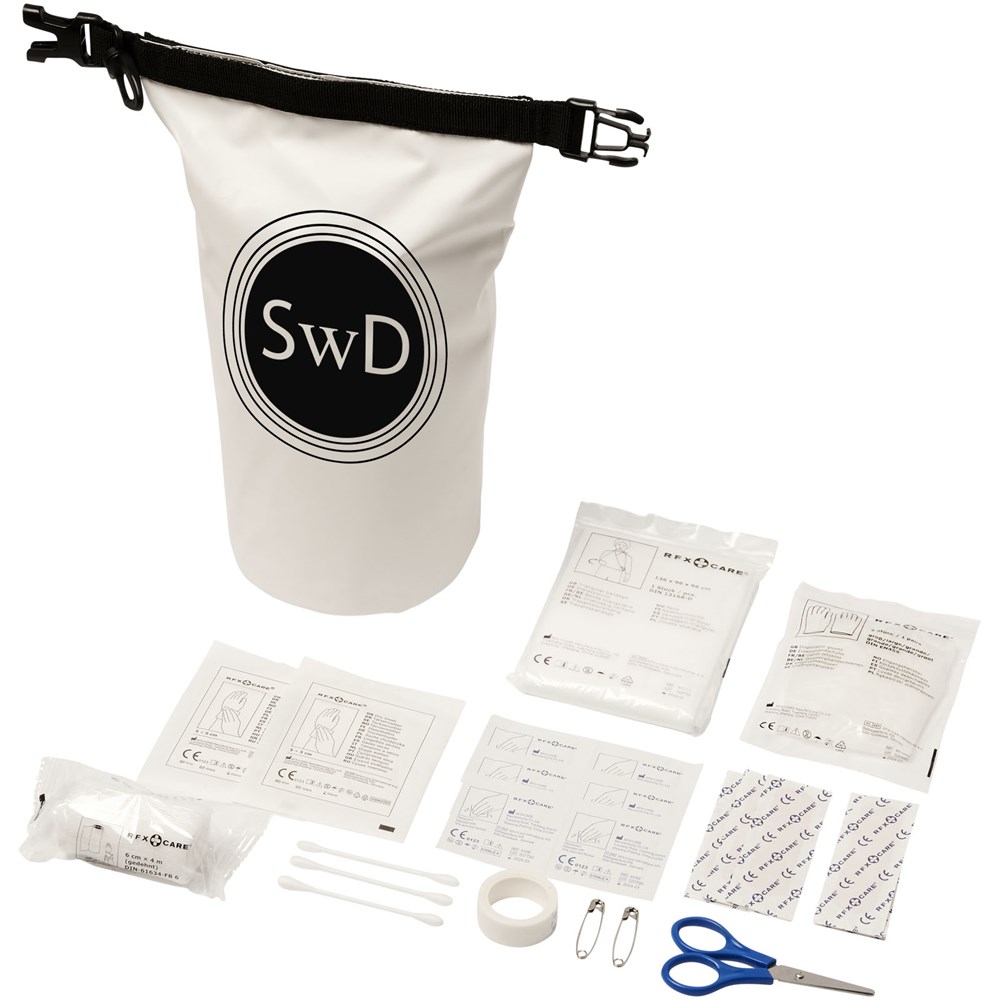 Sterke en duurzame waterdichte tarpaulinezak met 30 EHBO-benodigdheden. De sluiting met opgerolde bovenkant en kunststof gesp zorgt ervoor dat de waardevolle inhoud droog en veilig blijft. Zeer geschikt voor watersport en andere buitenactiviteiten. EHBO-sets helpen je bij het uitvoeren van een eenvoudige wondbehandeling om de secundaire verwondingen te verminderen. Een EHBO-set wordt beschouwd als een medisch hulpmiddel en is onderworpen aan 93/42/EEG, op basis van het beoogde gebruik: "diagnose, preventie, controle, behandeling of verlichting van ziekte". Dit medisch hulpmiddel is van KLASSE I, Is.