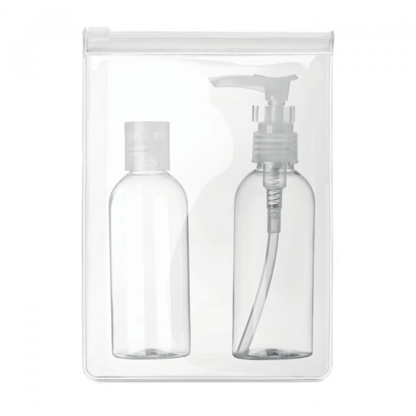 Flessenset in een PEVA-etui. Deze flesjes kunnen worden gevuld met handreiniger, zeep of andere vloeistoffen, om u veilig en schoon te houden. Een flesje heeft een flip dop die makkelijk te gebruiken is met gel-achtige vloeistoffen. Het andere flesje heeft een pompje, wat ideaal is voor andere vloeistoffen. Beide flesjes zijn gemaakt van PET. De flessen worden leeg geleverd. Inhoud: 100 ml per flesje.
