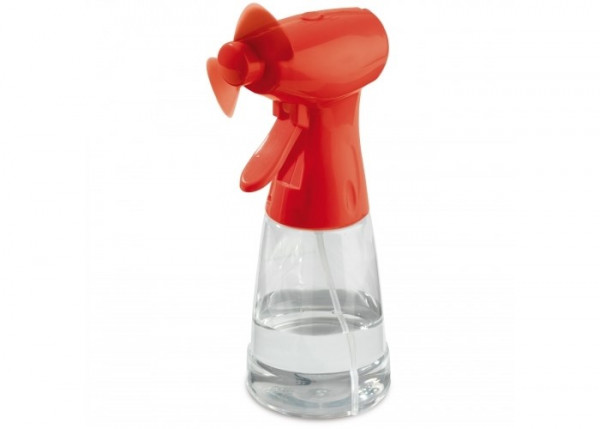 Ventilator met waterverstuiver in transparante fles met kunststof bovenzijde. Een fijne verkoeler en de ideale give-away voor een zomer events. De waterverstuiver werkt op twee AA-batterijen (niet meegeleverd).
