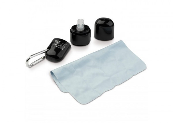Dispenser met een microvezeldoekje van 150x150mm en 8ml reinigingsspray. Voorzien van karabijnhaak. Maak een smartphone of tablet eenvoudig schoon en hang de spray op aan een tas.