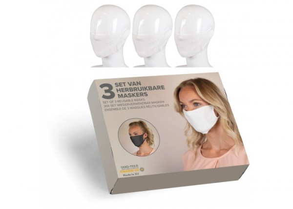 Set van 3 dubbellaags herbruikbare gezichtsmaskers met ruimte voor een filter voor extra bescherming gemaakt in Europa en verpakt in een geschenkdoosje. De maskers zijn gemaakt van zacht en rekbaar OEKO-TEX® gecertificeerd polyamide wat zorgt dat ze comfortabel zijn om te dragen. Het gezichtsmasker kan op 90 graden in de wasmachine worden gewassen. Let op: dit is geen medisch mondmasker of PBM (persoonlijke beschermingsmiddelen). Het bevat geen filter en is enkel bedoeld voor persoonlijk gebruik. Wassen voor gebruik.