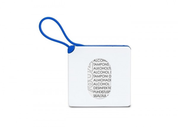 Compacte houder met 15 alcoholdoekjes (75% alcohol). De stevige houder beschermt de inhoud en kan nagevuld worden. De siliconen van sluit de houder af en kan ook gebruikt worden om het aan een tas of ander voorwerp te hangen.