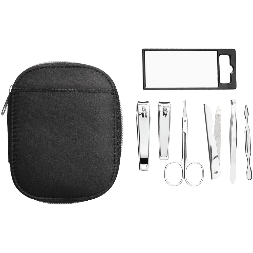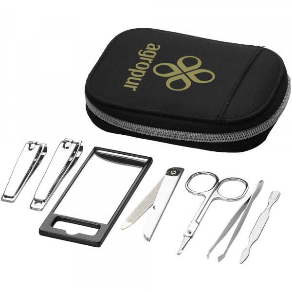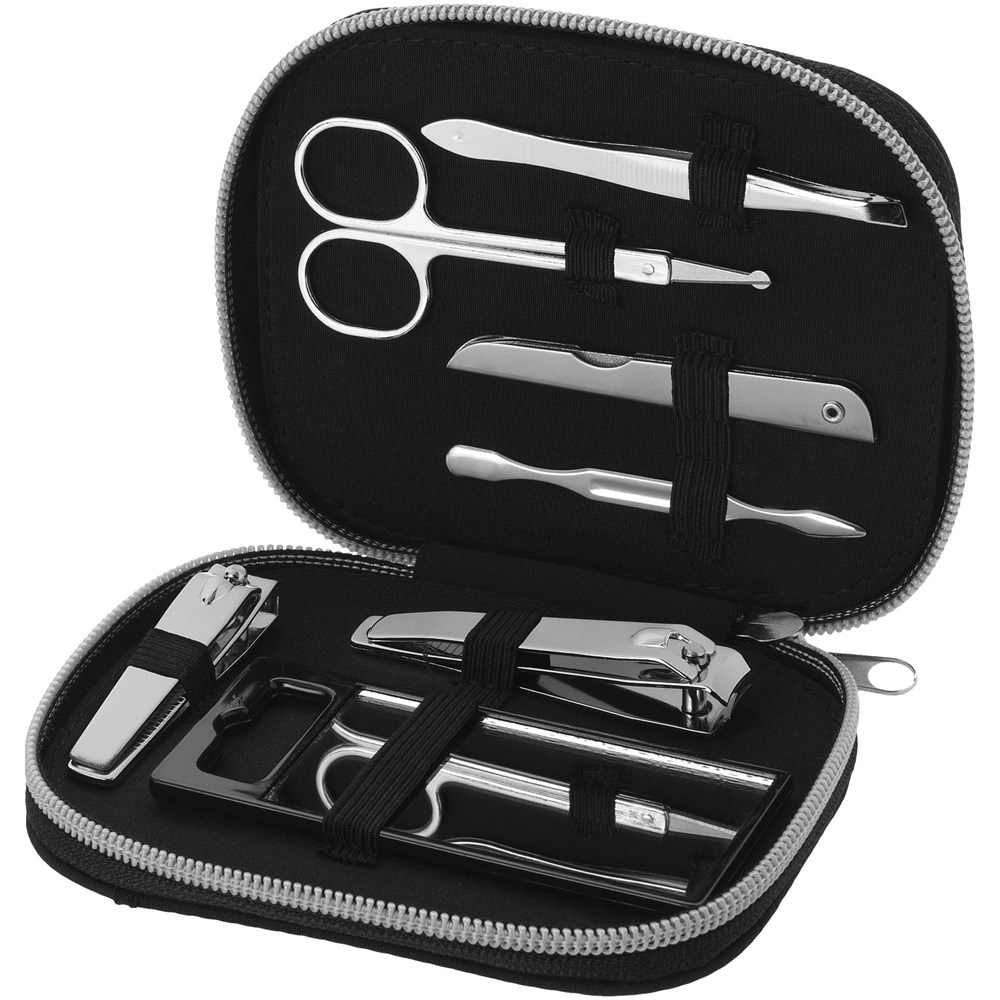 Zo ziet u er altijd op uw best uit. Set bestaande uit spiegel, pincet, nagelknipper, teennagelknipper, schaar, nagelvijl en nagelriemverzorger. De set wordt geleverd in een nylon hoes.