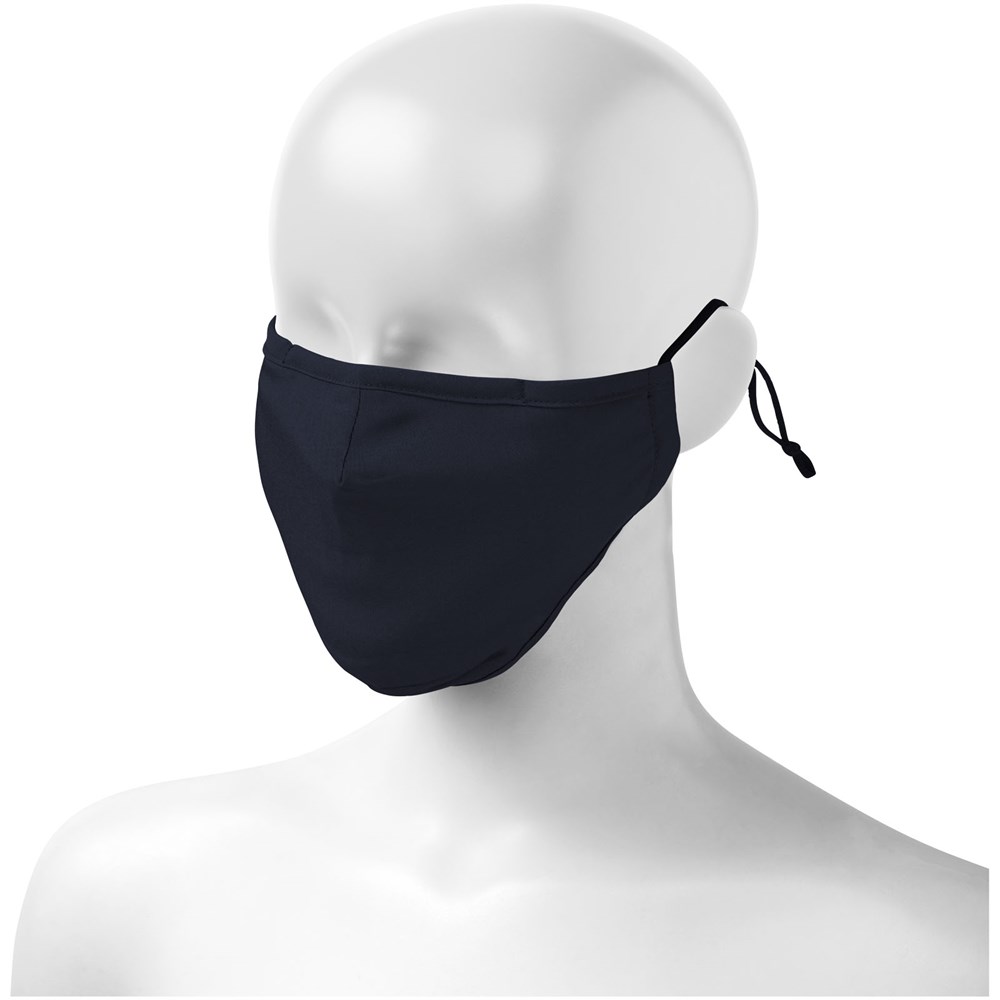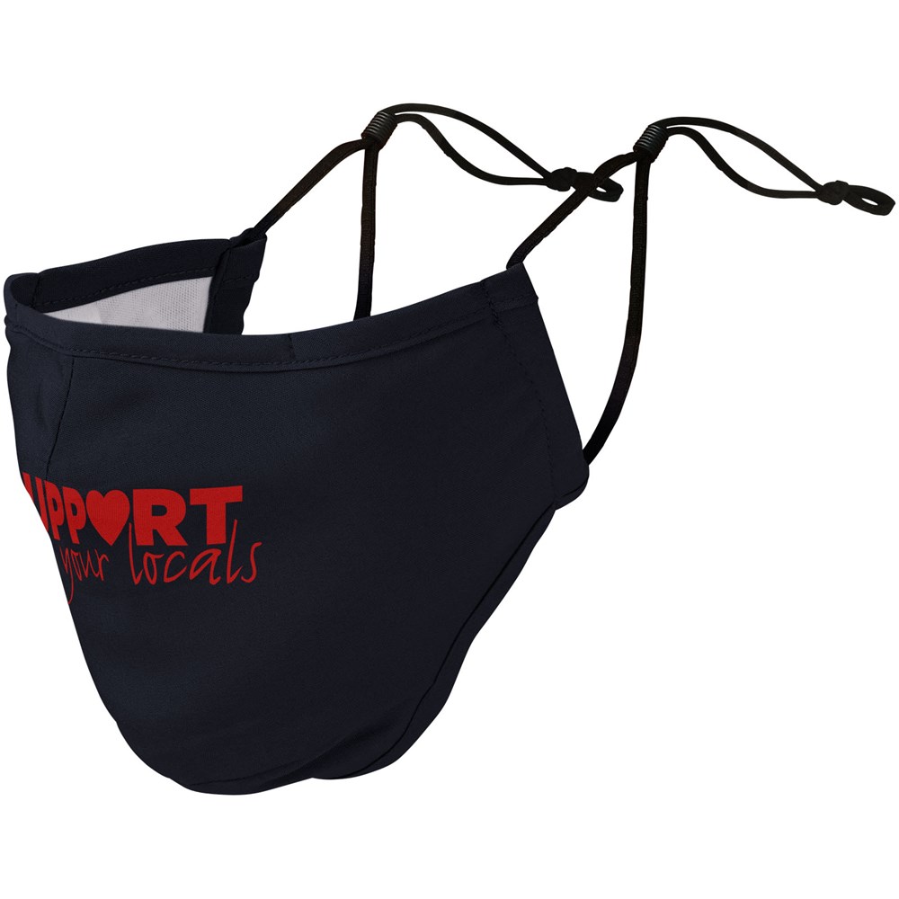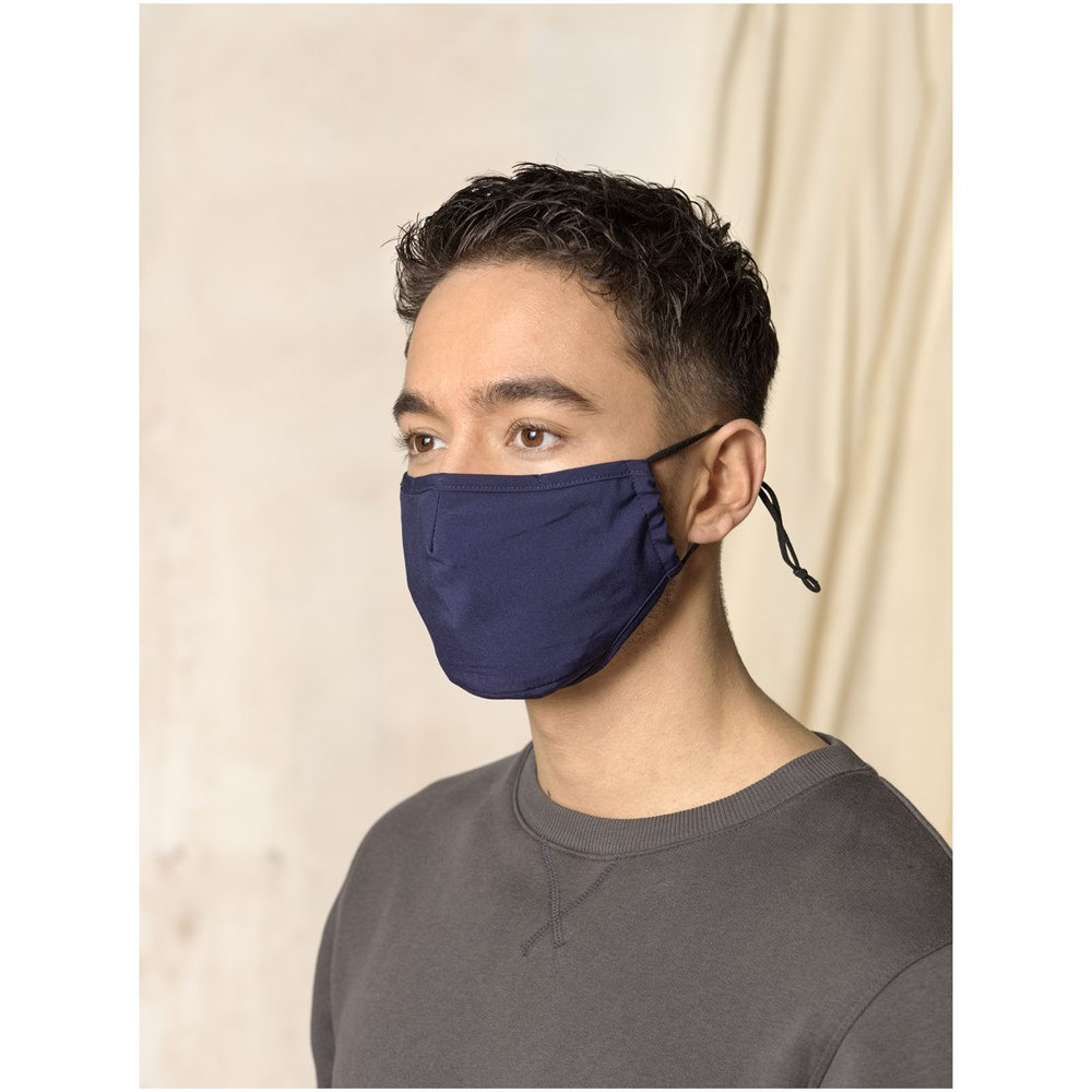 Tweelaags mondmasker Filtervak (filter niet inbegrepen). Metalen neusbrug. Elastische bandjes met verstelbare stop. Ergonomische vorm om mond en kin te beschermen. Wasbaar op 60 graden. Gemaakt van lichtgewicht en comfortabel 94% gecertificeerd gerecycled polyester en 6% elastaan. GRS-certificering garandeert een 100% gecertificeerde toeleveringsketen. Het gebruik van dit masker is uitsluitend voorbehouden voor niet-sanitaire doeleinden. Dit hulpmiddel is geen medisch hulpmiddel in de zin van regelgeving EU/2017/745 (chirurgische maskers) noch valt het onder de persoonlijke beschermingsmiddelen in de zin van Verordening EU/2016/425 (zoals filtermaskers type FFP2 of FFP3). Dit product is niet geschikt voor medisch gebruik en beschermt niet tegen infecties.